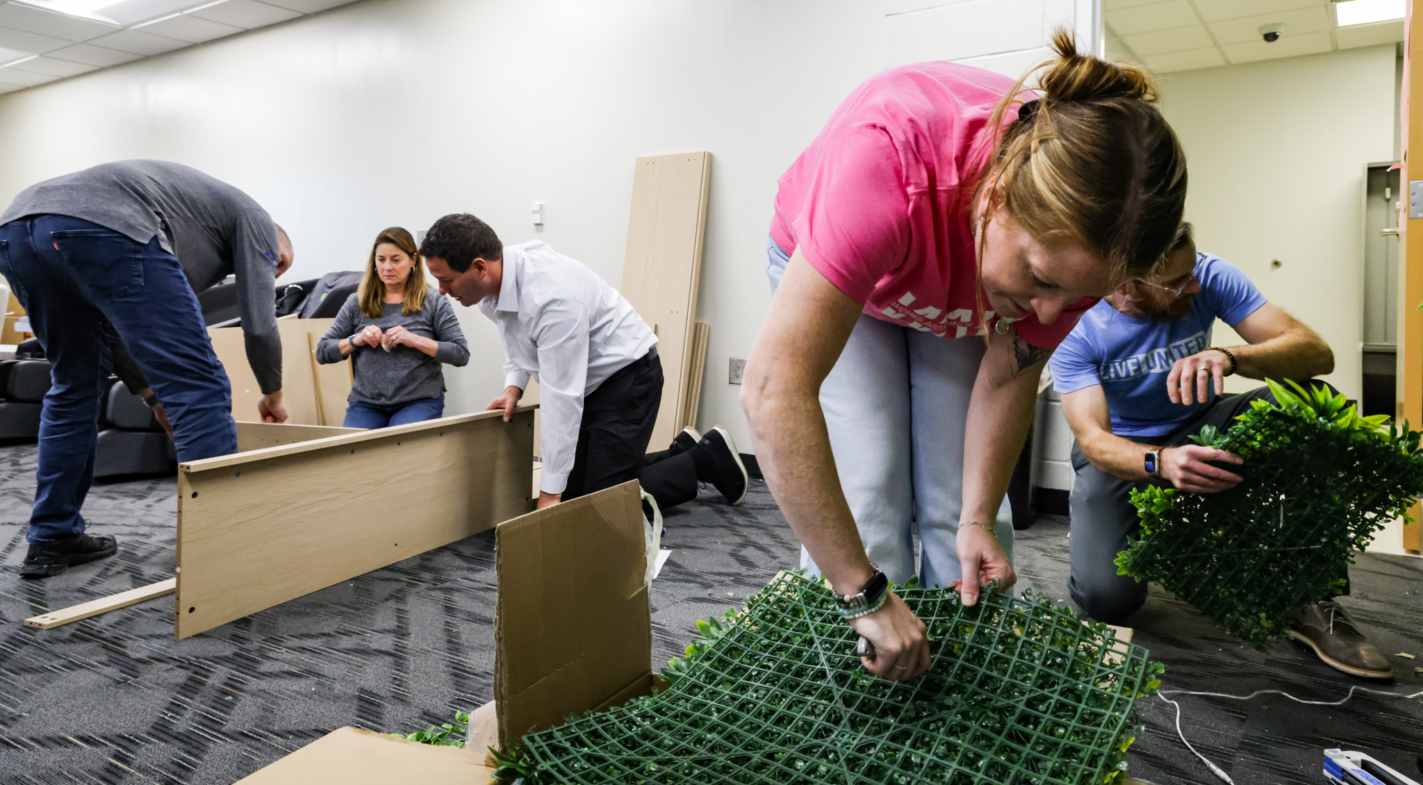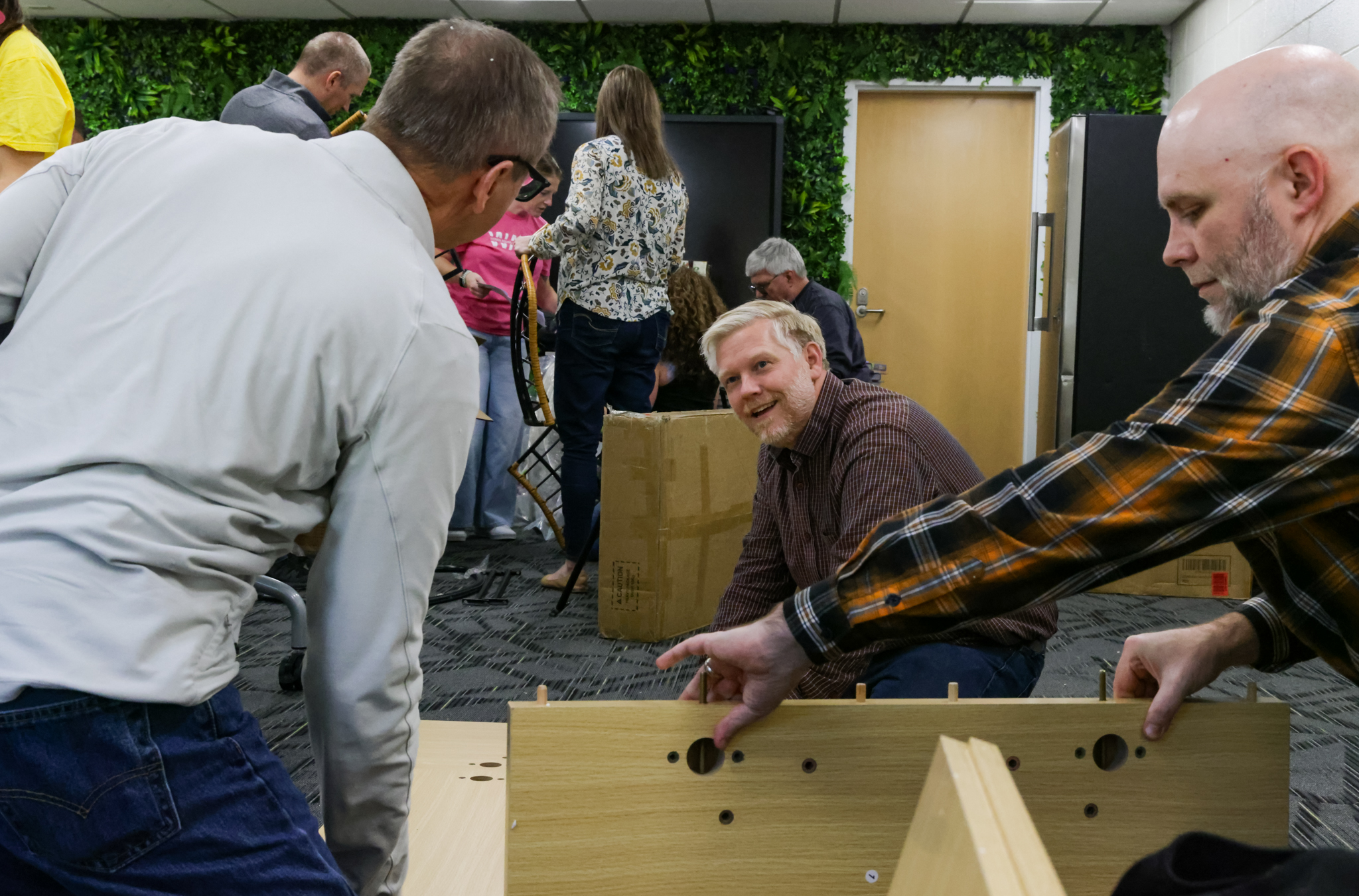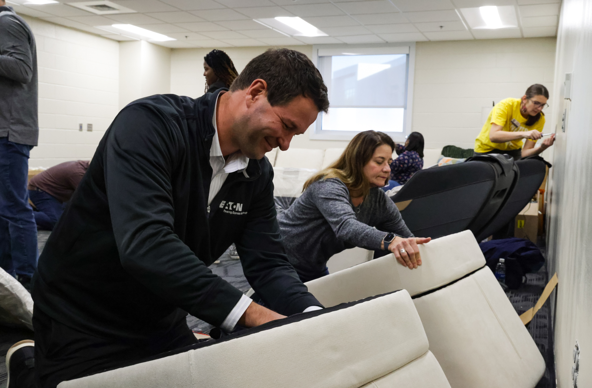 They walked into a large room that was filled with boxes of disassembled furniture. Coffee tables, lounge chairs, meeting tables — all waiting to be transformed into something meaningful. Without hesitation, the Eaton team began unpacking, assembling, and arranging. Teams formed and optimized the furniture building, laughing could be heard from all corners of the room.