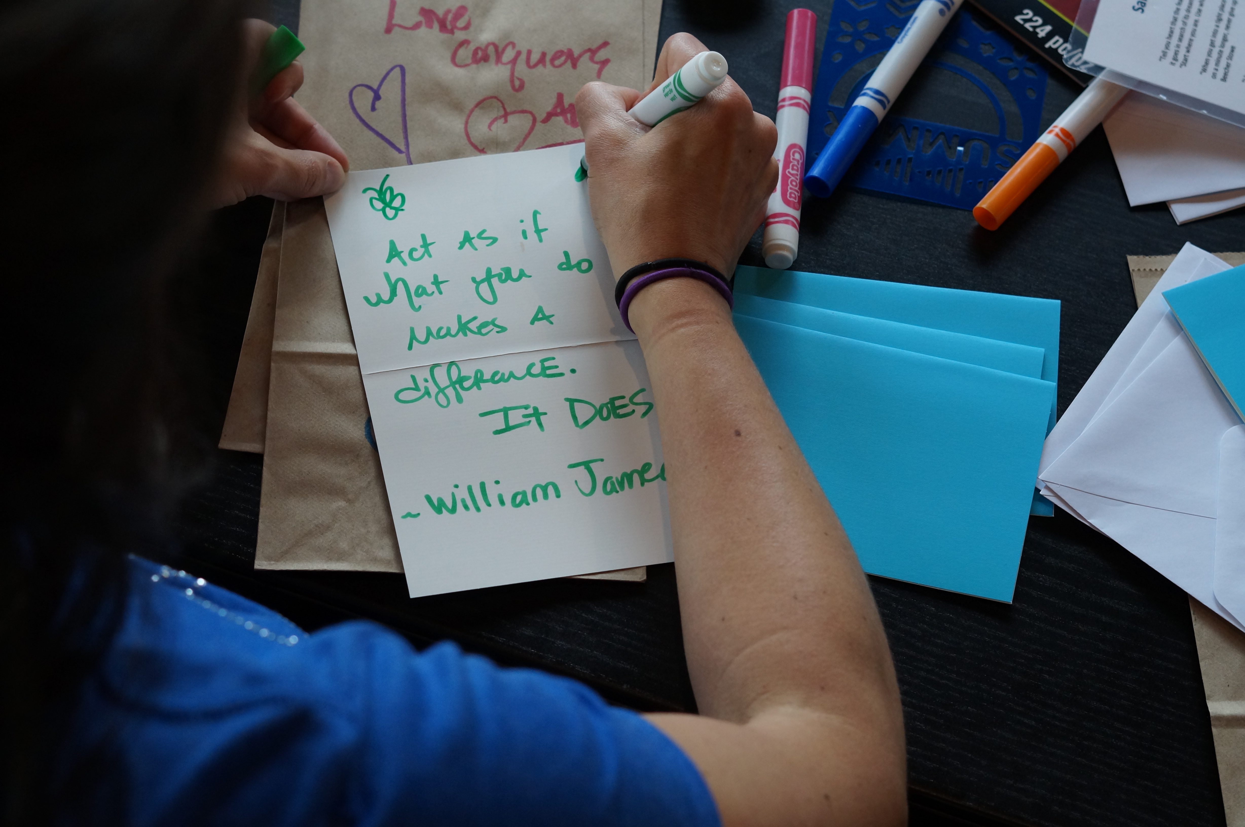 These kits are not made in a one-size-fits-all approach. Our Community Engagement team spends time heading out into our county to talk to school staff, first responders, the unhoused, and other nonprofit organizations to figure out what needs to be in each kit. When we hear a need, we connect the resources we have, design a kit, and bring in volunteers to add the final beautiful touches. This often includes handwritten notes, song lyrics, and sometimes specialty bags.